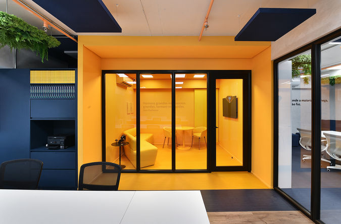 A sala amarela comporta até seis pessoas e a cor escolhida foi por conta do logotipo da ferramenta Power BI e que recebe tons em amarelo e queríamos transmitir a sensação de energia, além de estimular o raciocínio e criatividade.